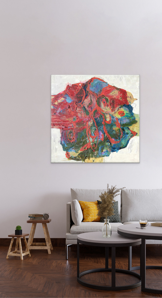 The painting, titled “The Beauty of the Red Forms,” is a captivating piece that beautifully captures the dynamic flow of shapes in a vibrant palette. Crafted on a stretched canvas, this artwork is meticulously rendered using rich oil paints.